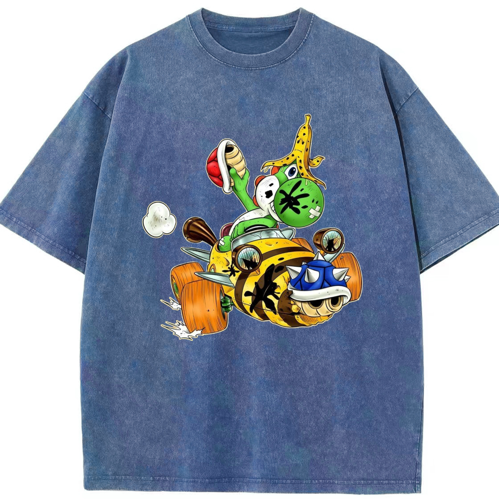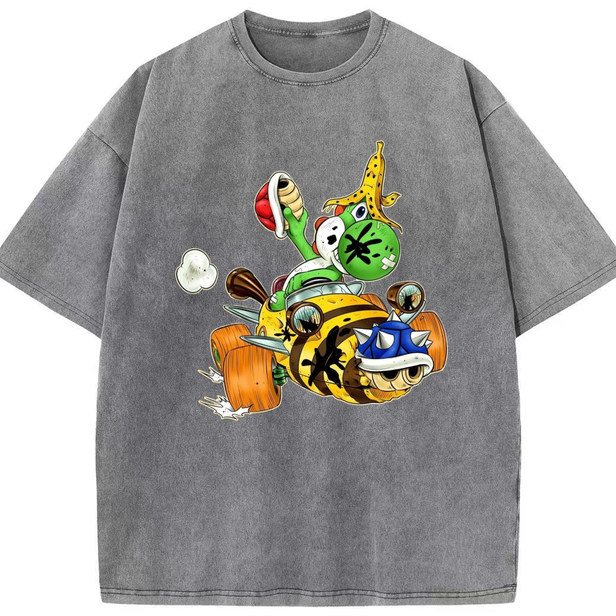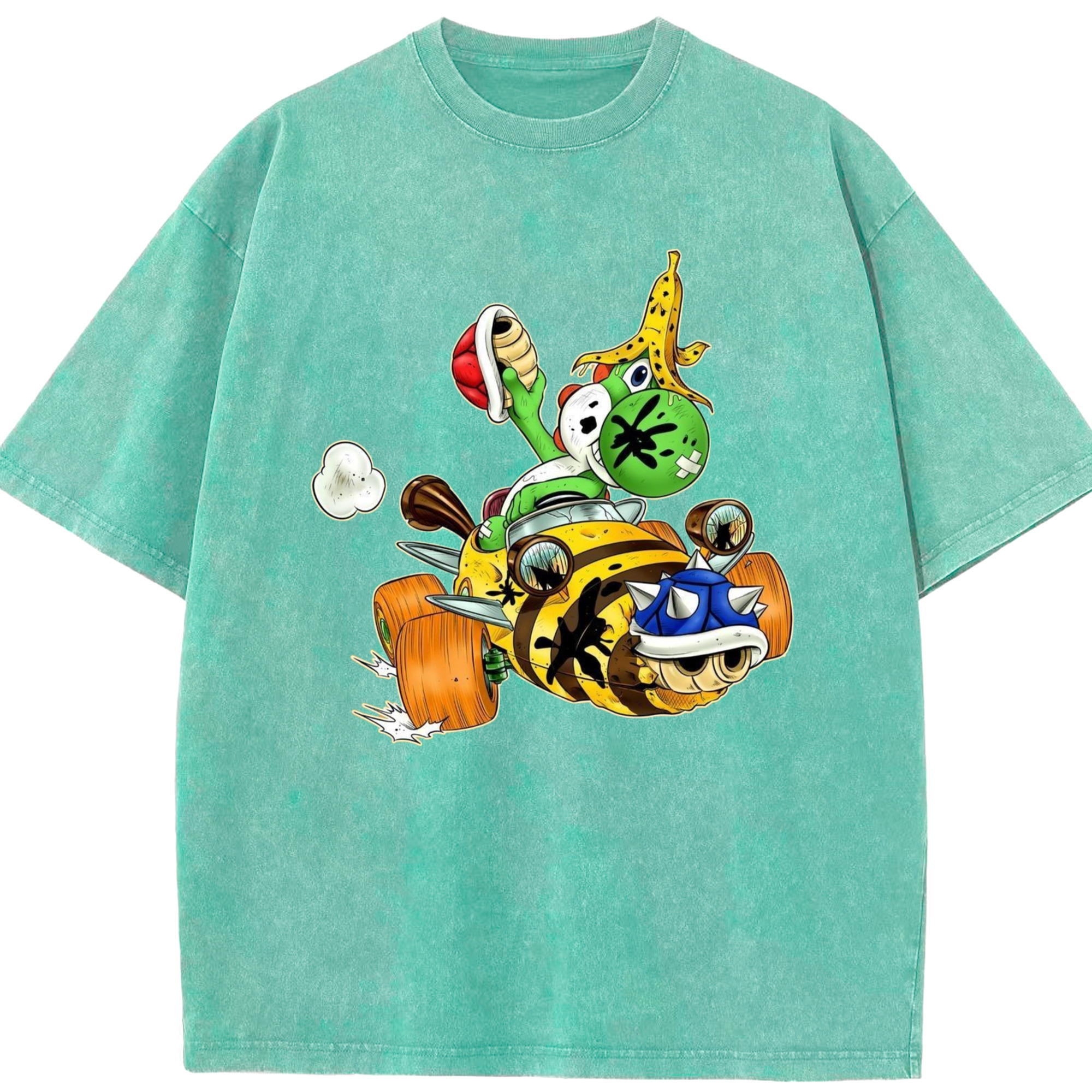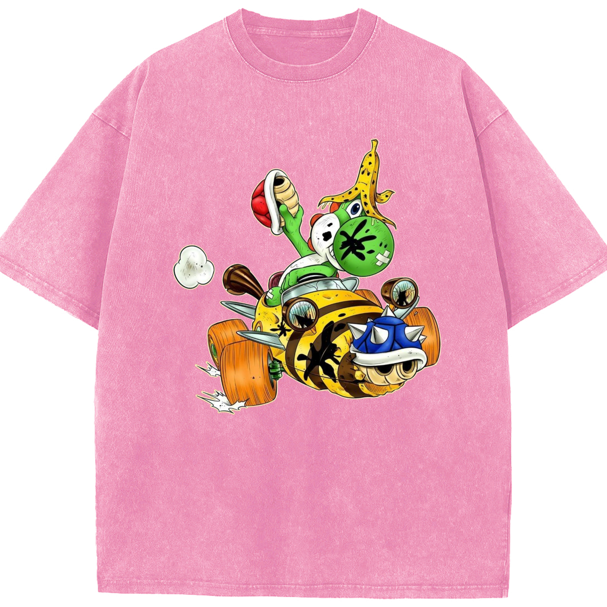 Super Mario Yoshi kart T-shirt - Washed Vintage Look 230g Cotton Oversized T-Shirt With Front Heat Transfer Print – Soft, Lightweight, Stylish Fit – Comfortable Casual Wear For Sports & Everyday Use