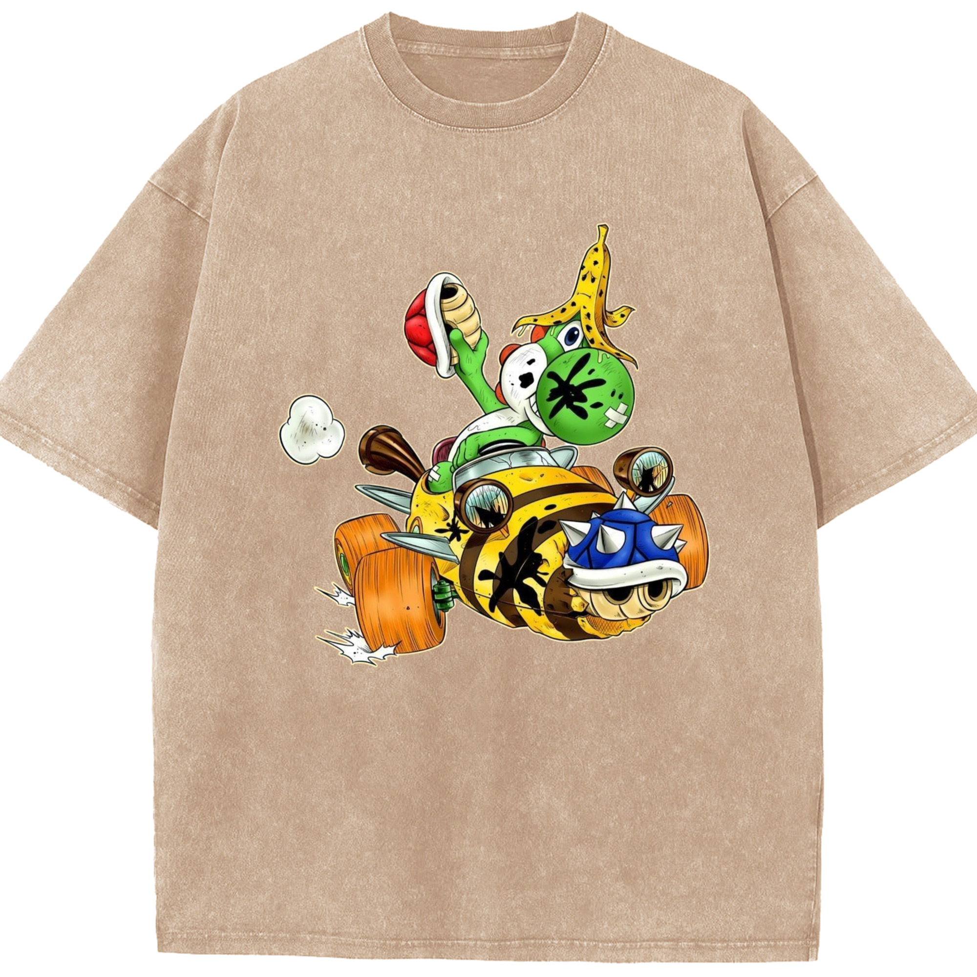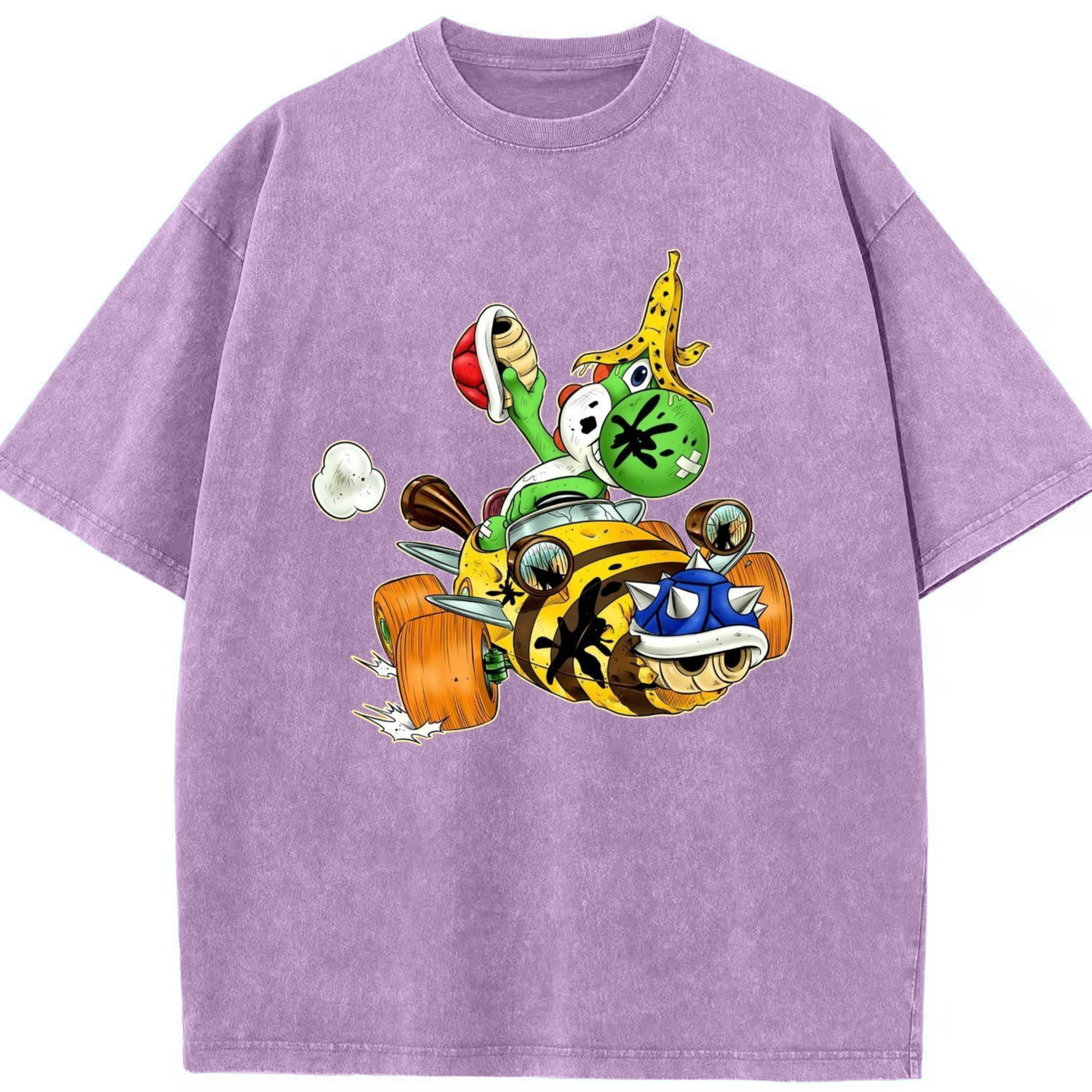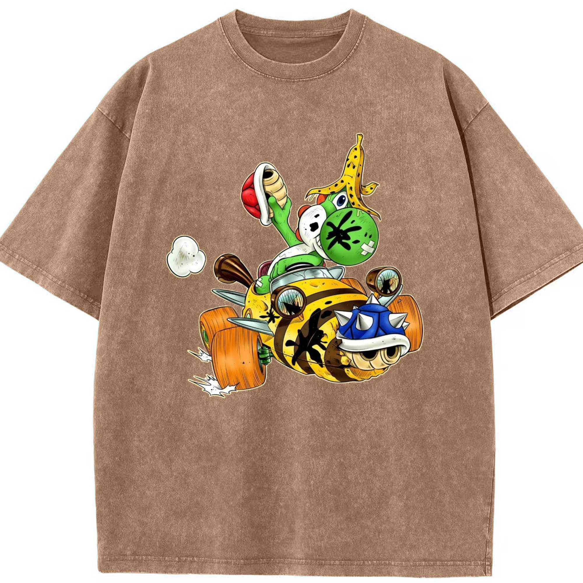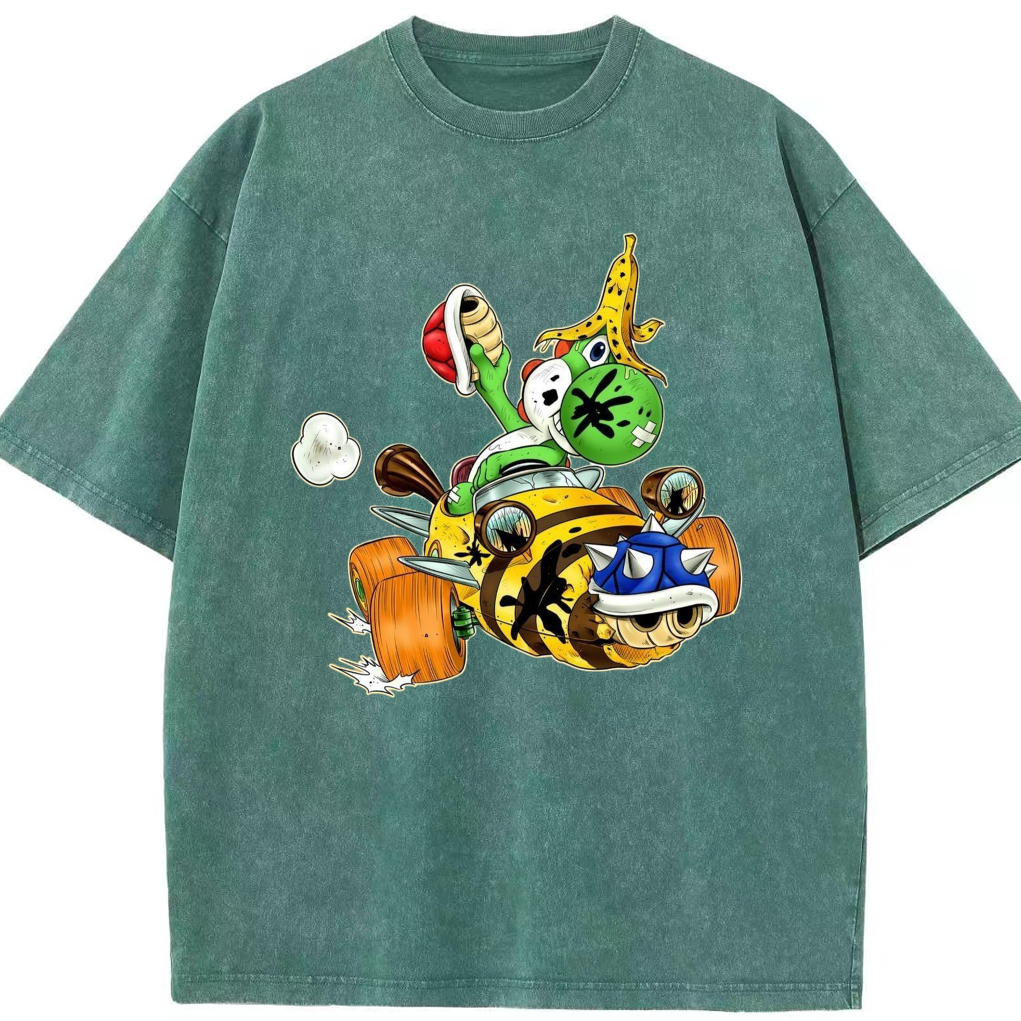 Super Mario Yoshi kart T-shirt - Washed Vintage Look 230g Cotton Oversized T-Shirt With Front Heat Transfer Print – Soft, Lightweight, Stylish Fit – Comfortable Casual Wear For Sports & Everyday Use