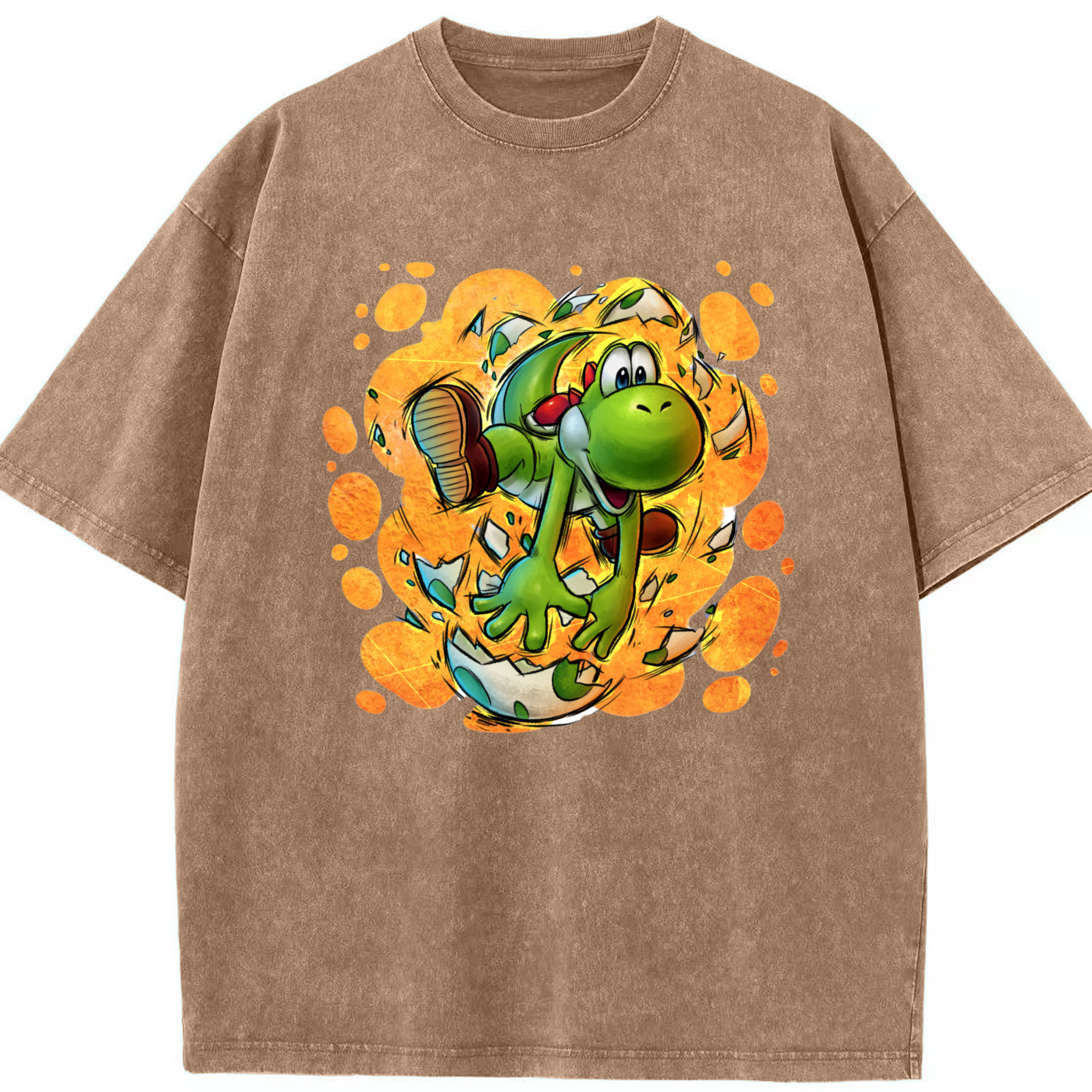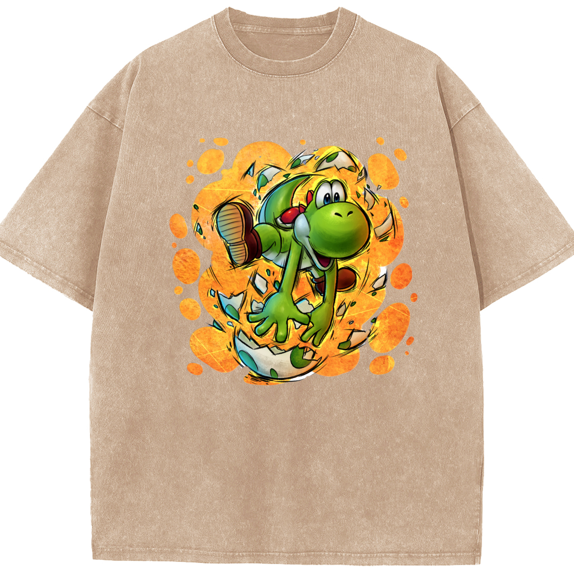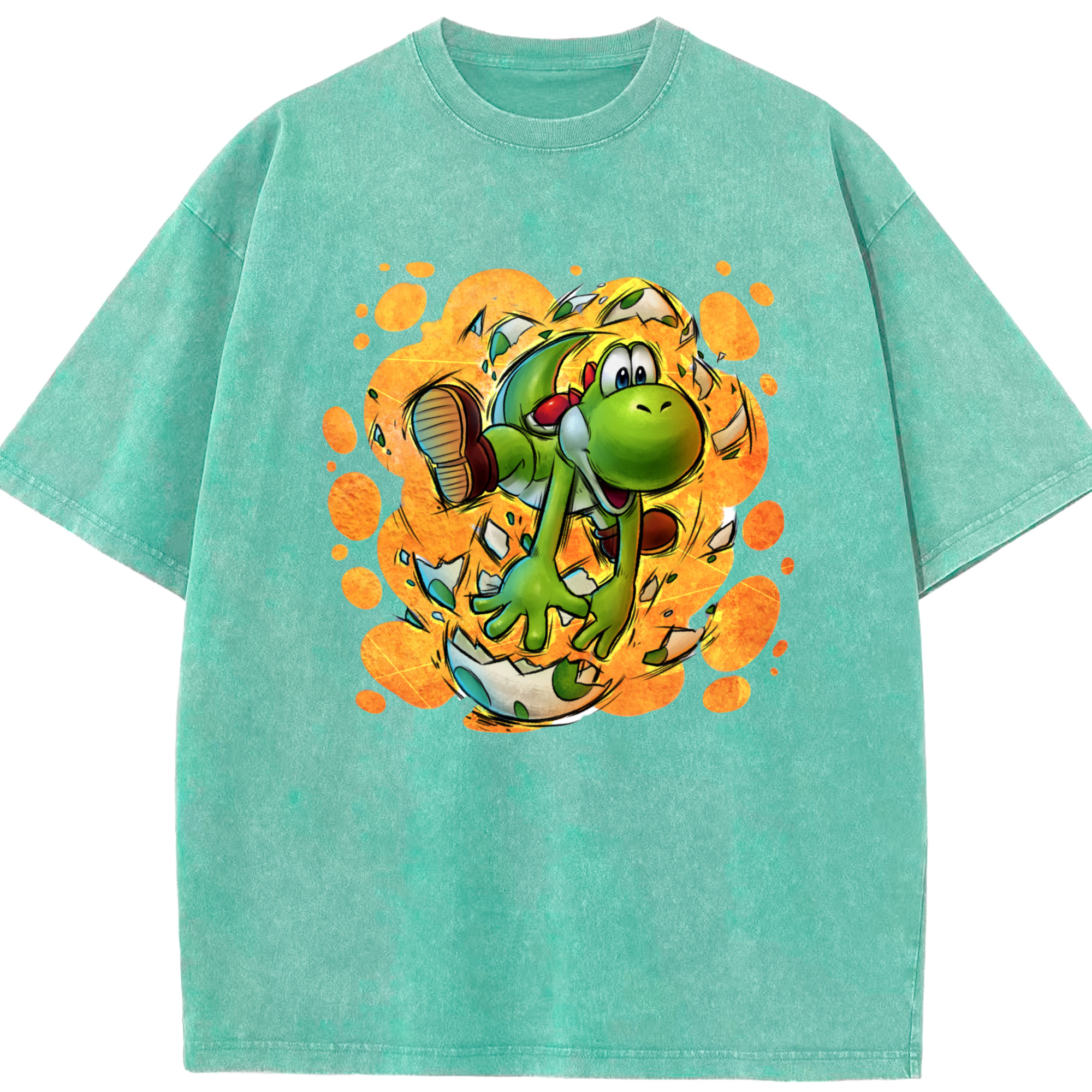 Super Mario Yoshi Painted style Tee - Washed Vintage Look 230g Cotton Oversized T-Shirt With Front Heat Transfer Print – Soft, Lightweight, Stylish Fit – Comfortable Casual Wear For Sports & Everyday Use