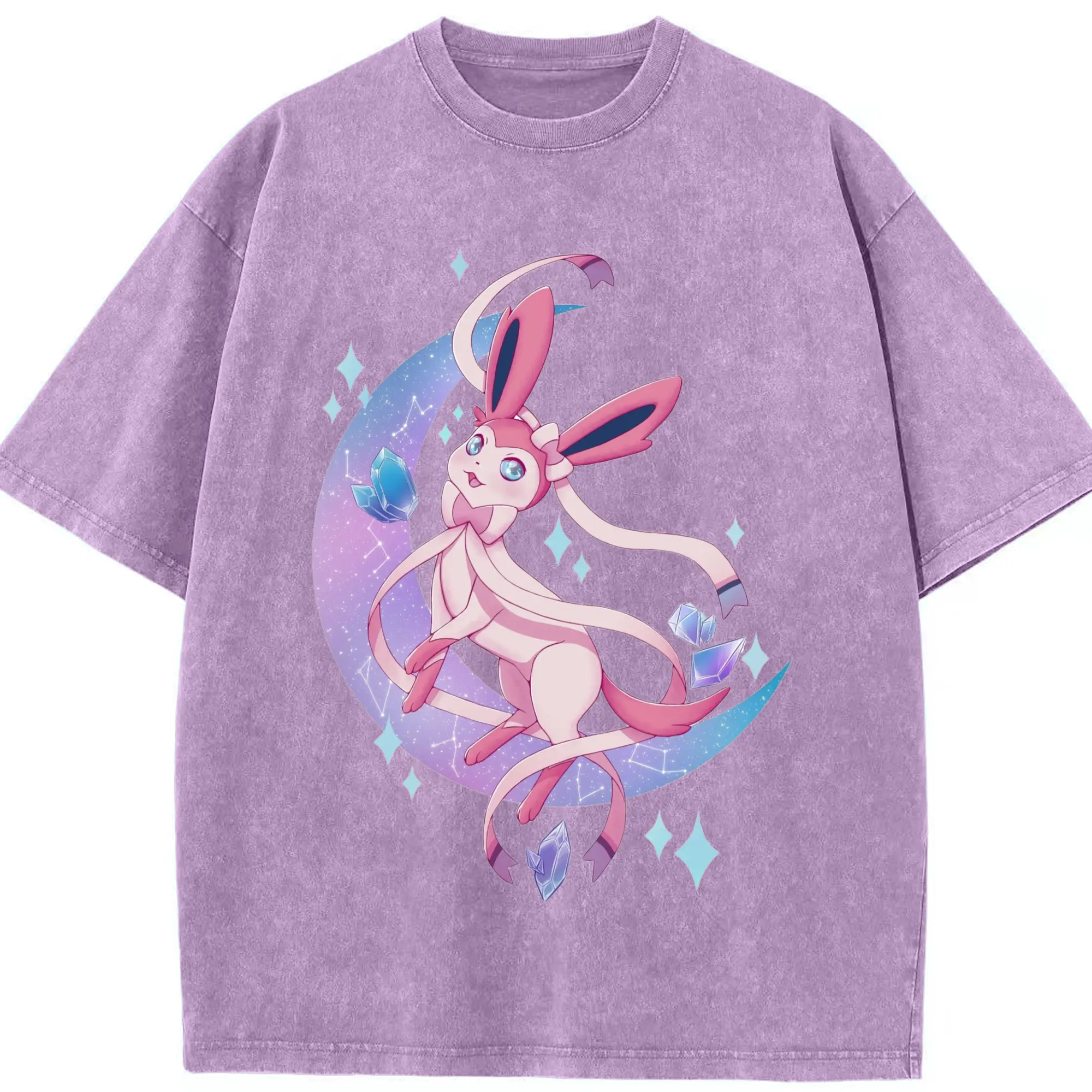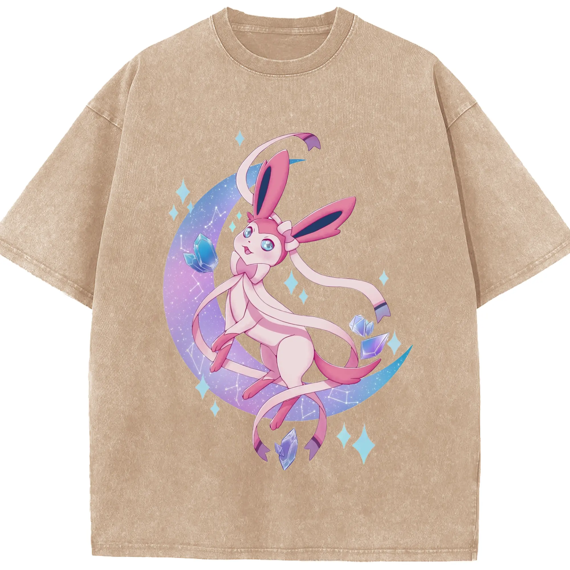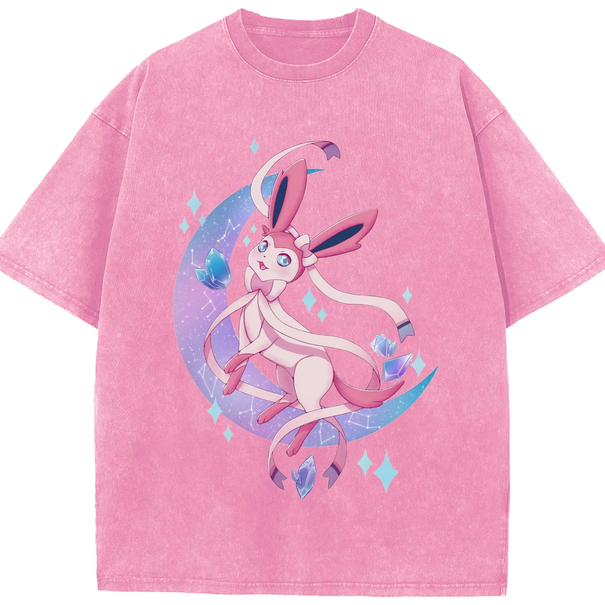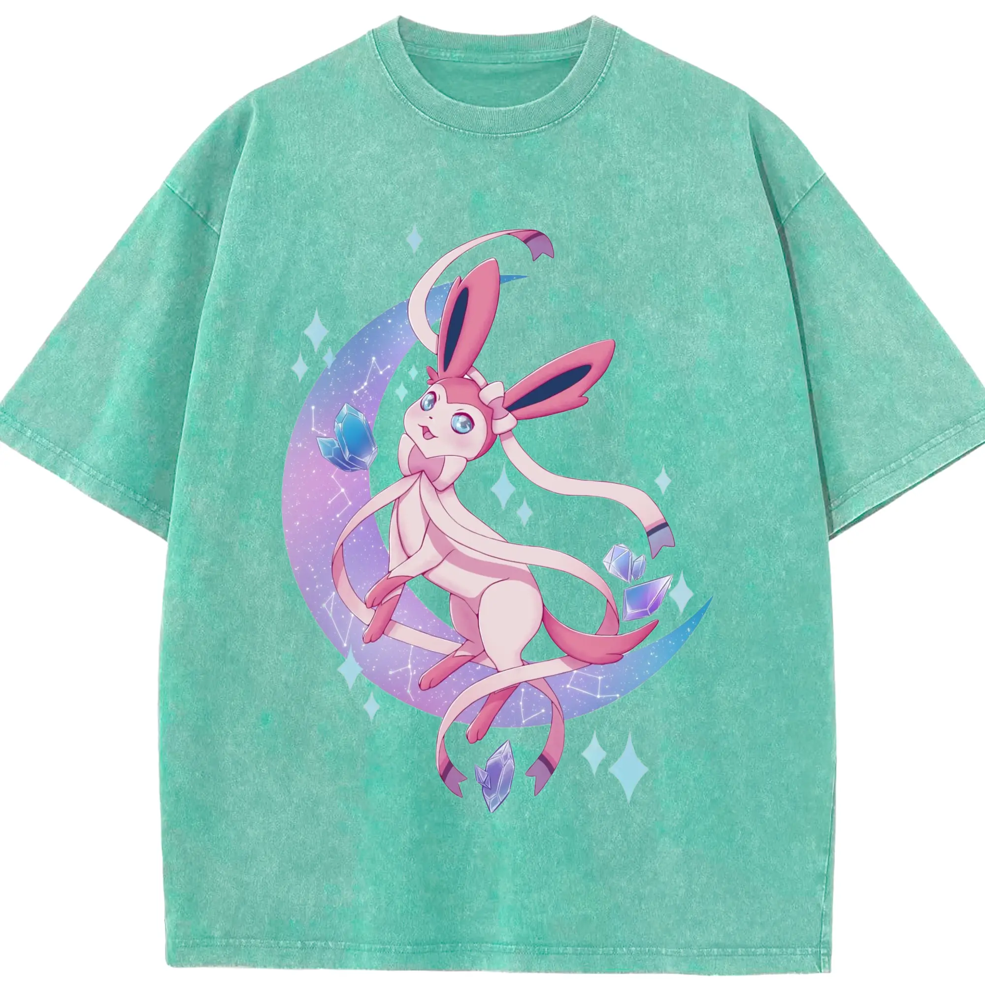 Sylveon girls tee - Washed Vintage Look 230g Cotton Oversized T-Shirt With Front Heat Transfer Print – Soft, Lightweight, Stylish Fit – Comfortable Casual Wear For Sports & Everyday Use