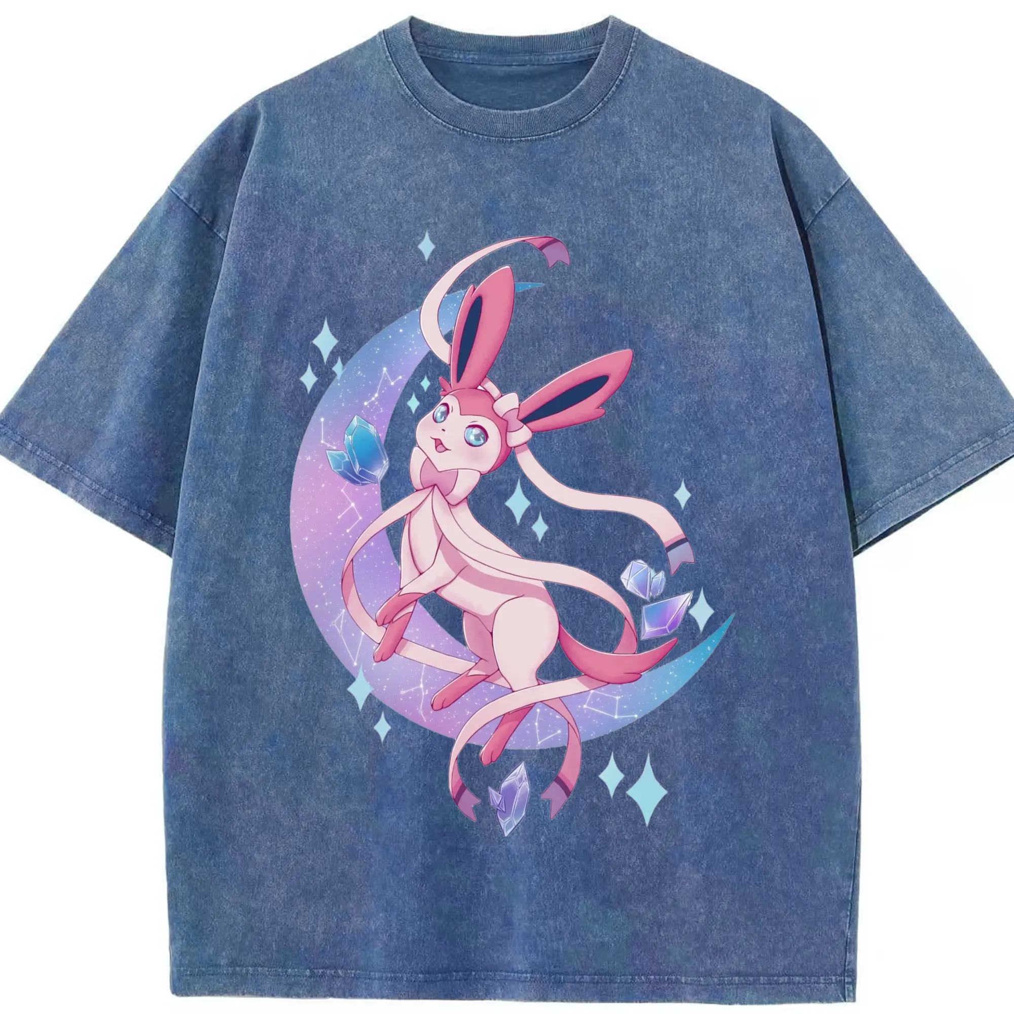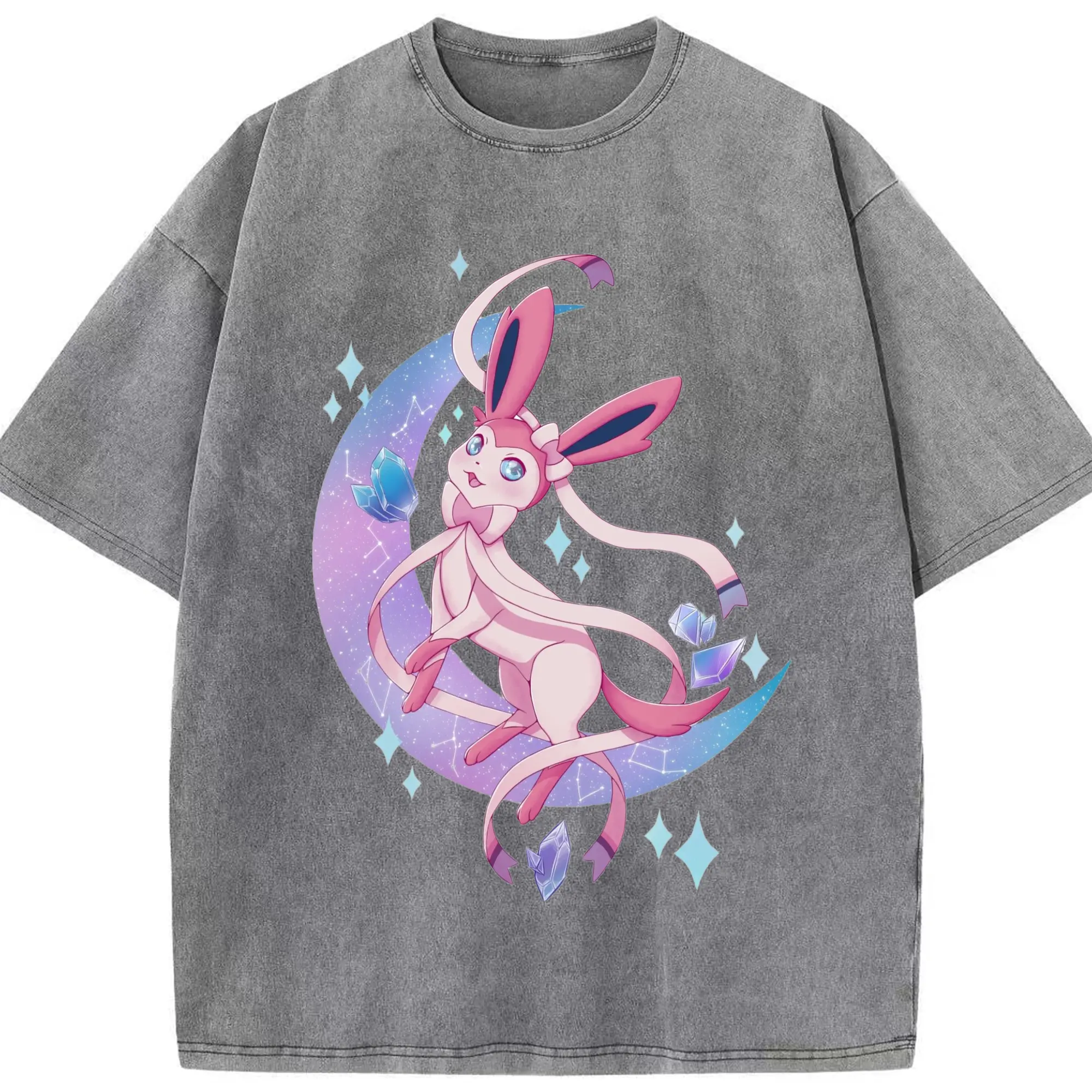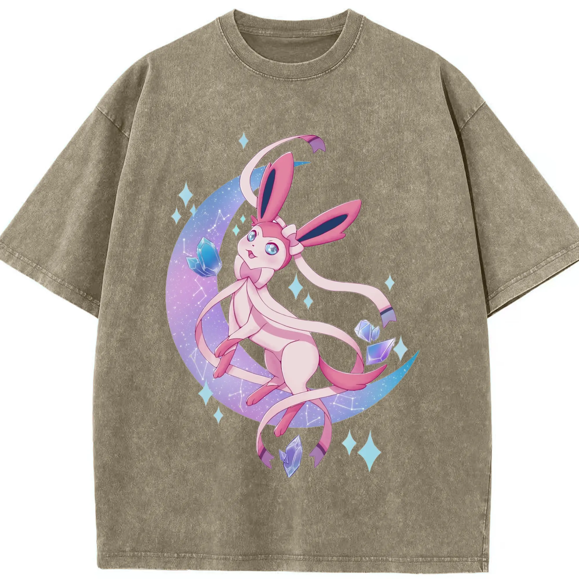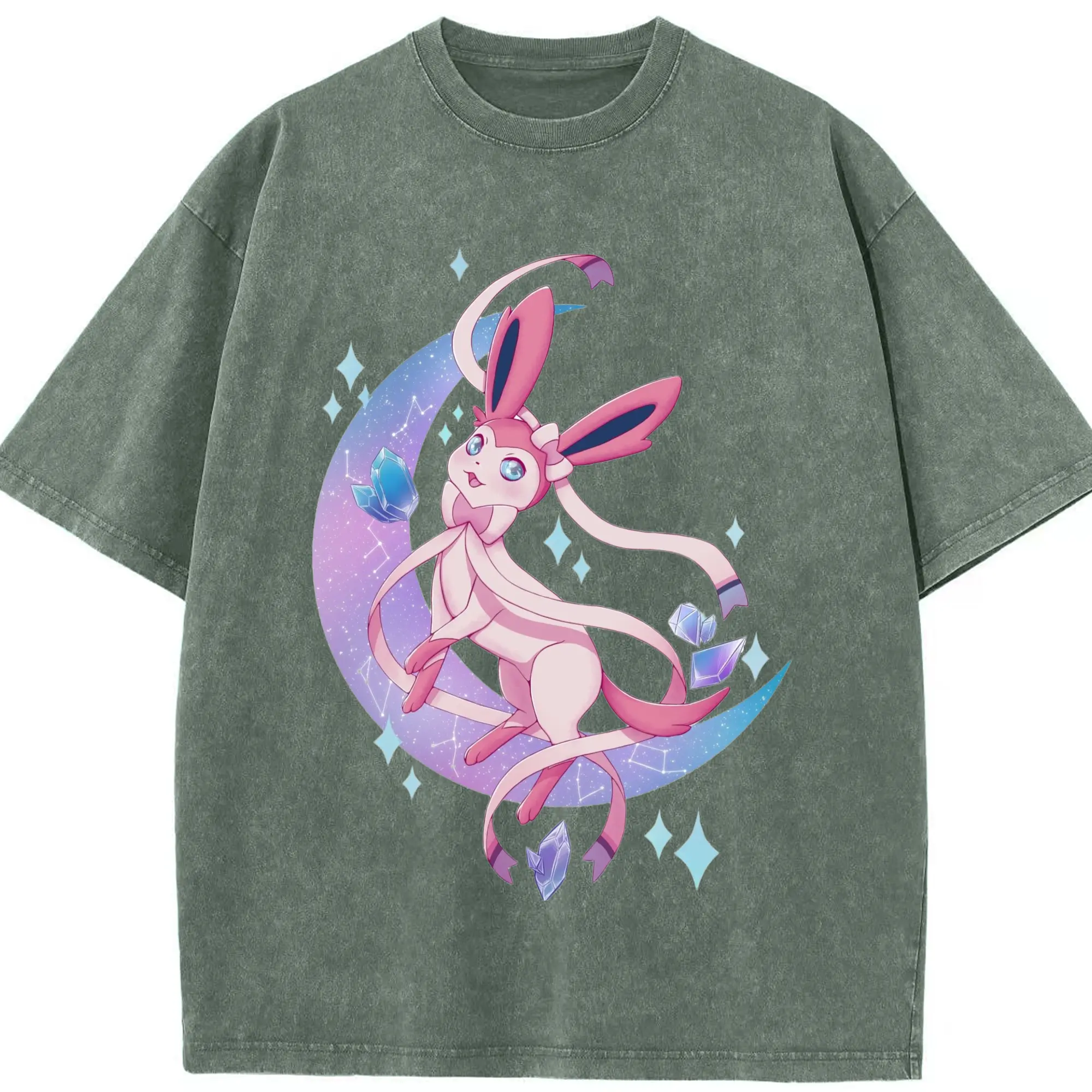 Sylveon girls tee - Washed Vintage Look 230g Cotton Oversized T-Shirt With Front Heat Transfer Print – Soft, Lightweight, Stylish Fit – Comfortable Casual Wear For Sports & Everyday Use