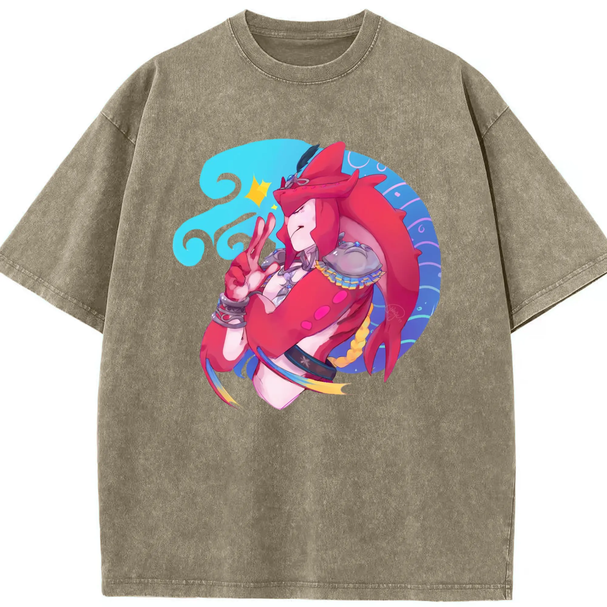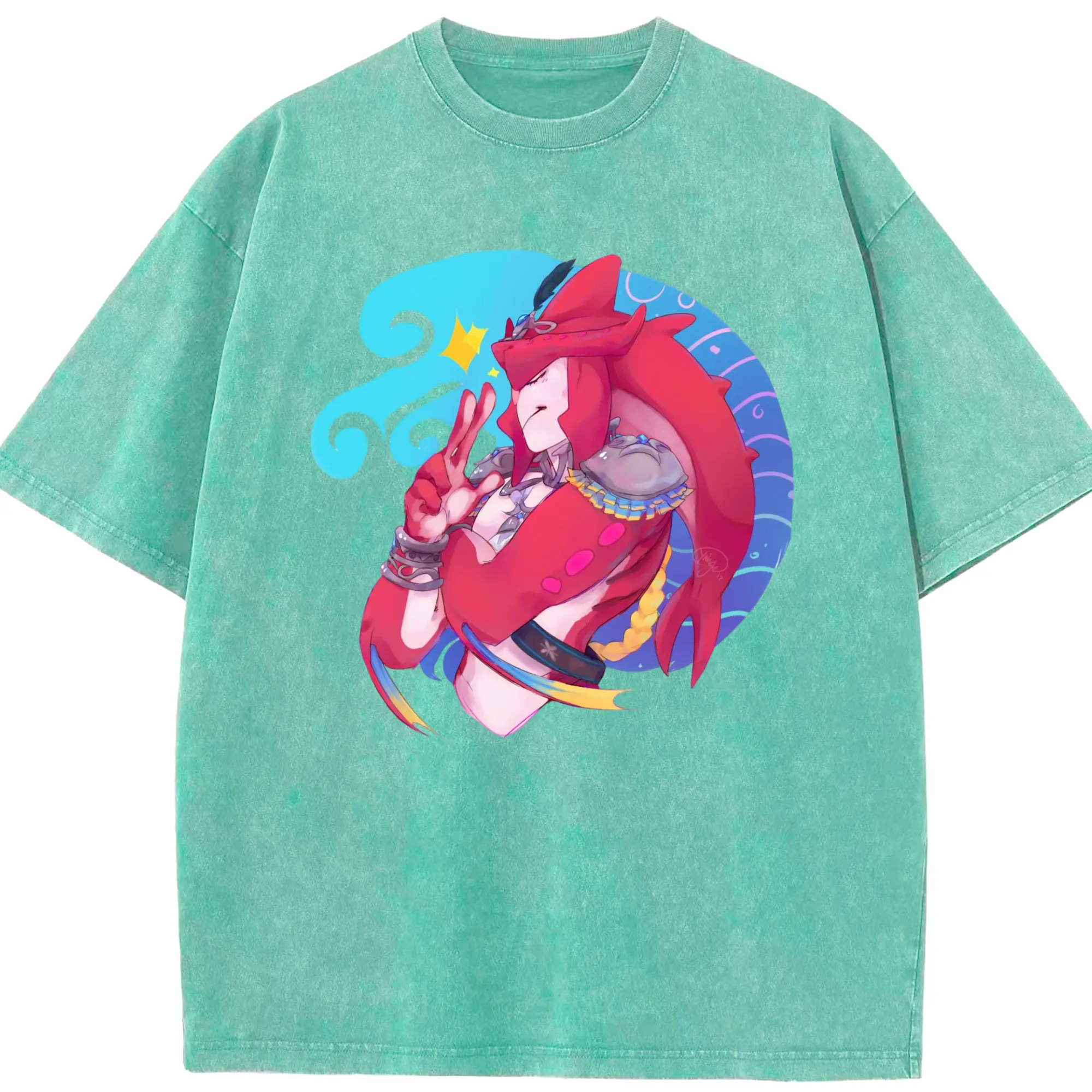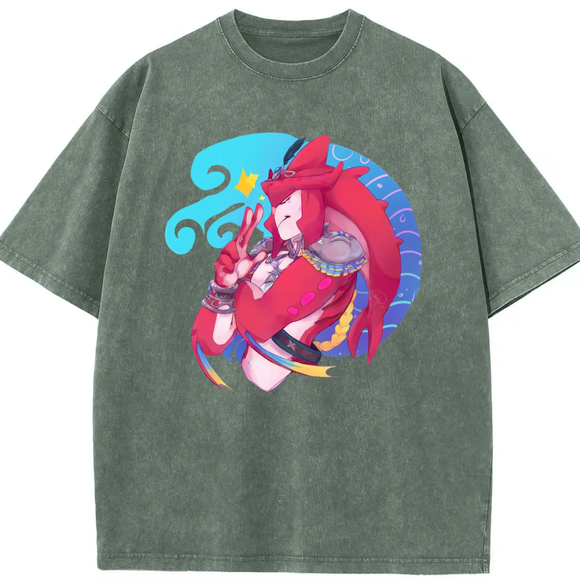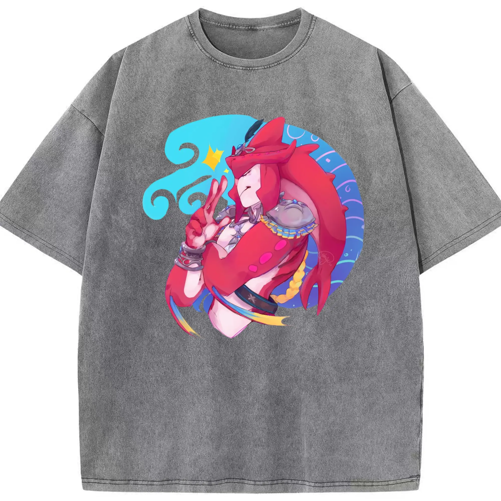 The legend of zelda Sidon graphic tee - Washed Vintage Look 230g Cotton Oversized T-Shirt With Front Heat Transfer Print – Soft, Lightweight, Stylish Fit – Comfortable Casual Wear For Sports & Everyday Use