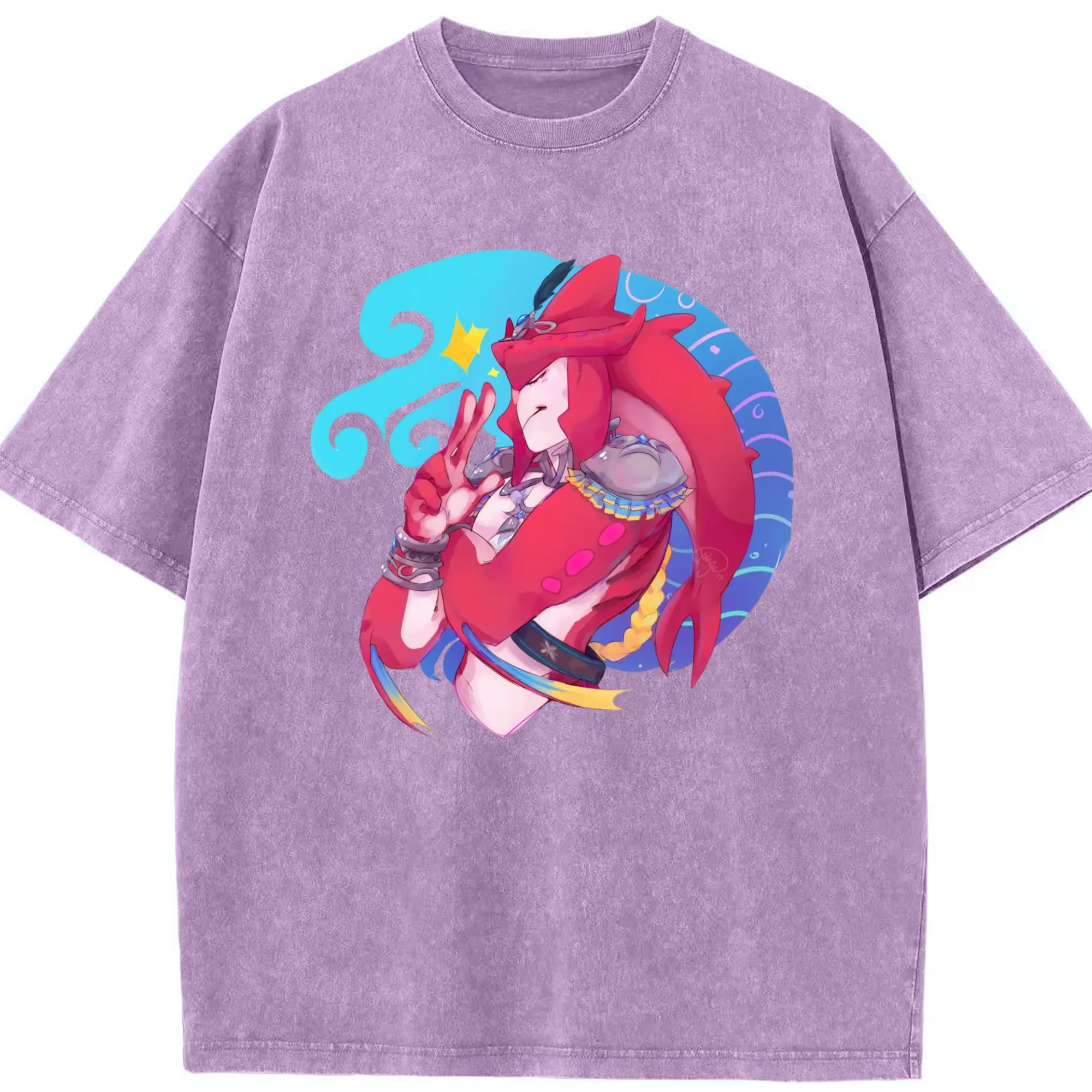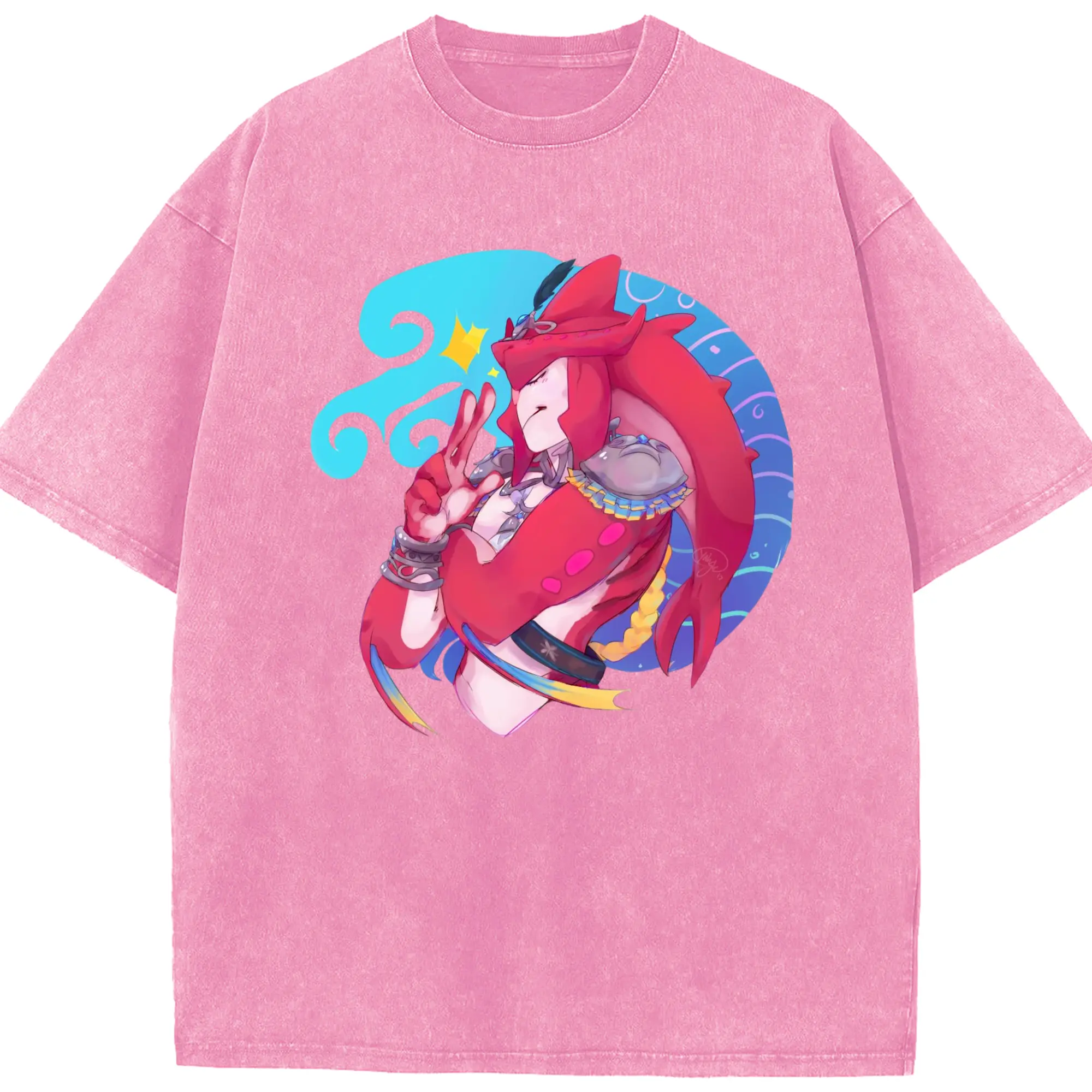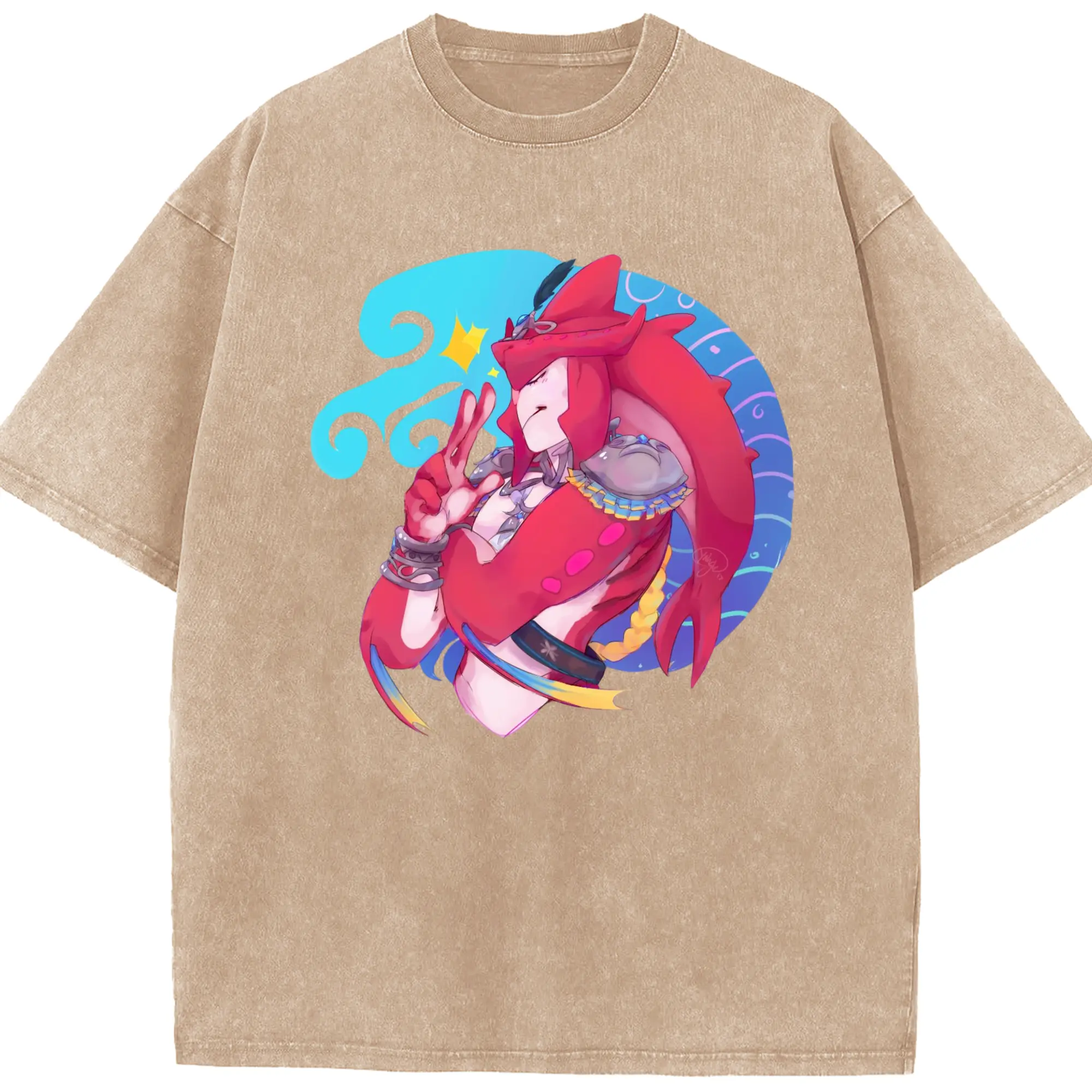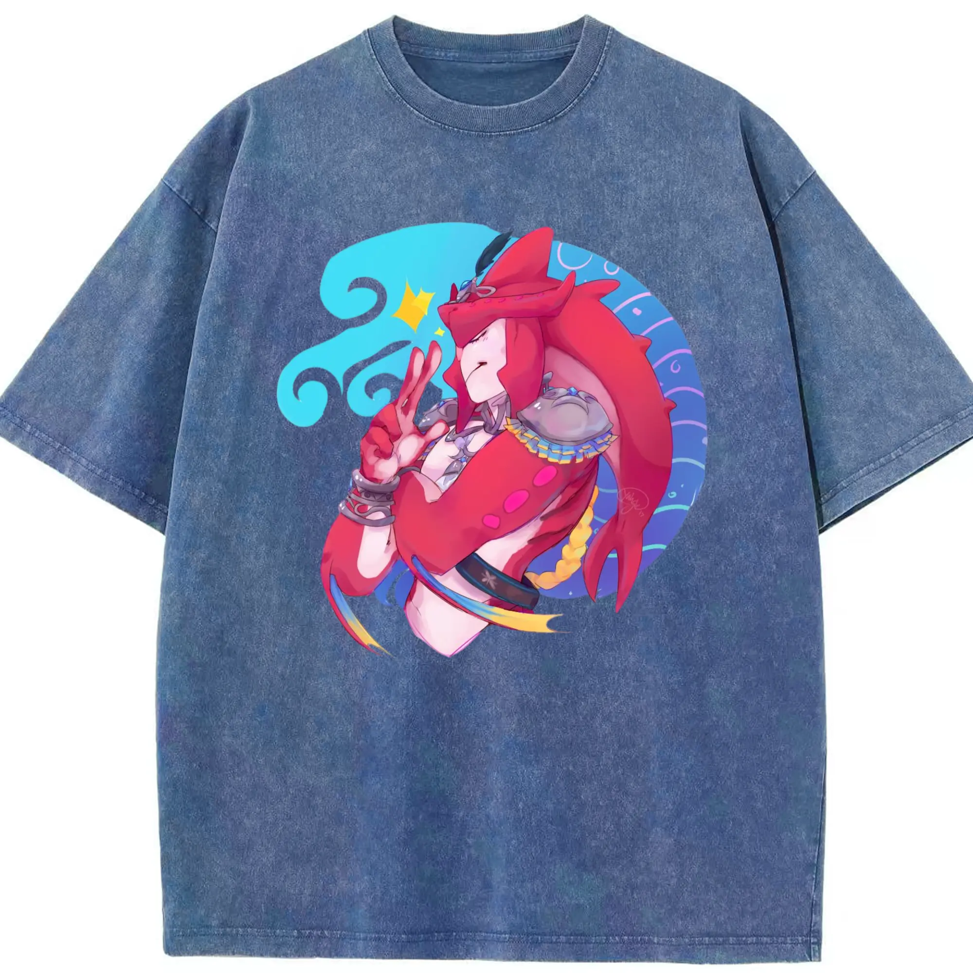 The legend of zelda Sidon graphic tee - Washed Vintage Look 230g Cotton Oversized T-Shirt With Front Heat Transfer Print – Soft, Lightweight, Stylish Fit – Comfortable Casual Wear For Sports & Everyday Use