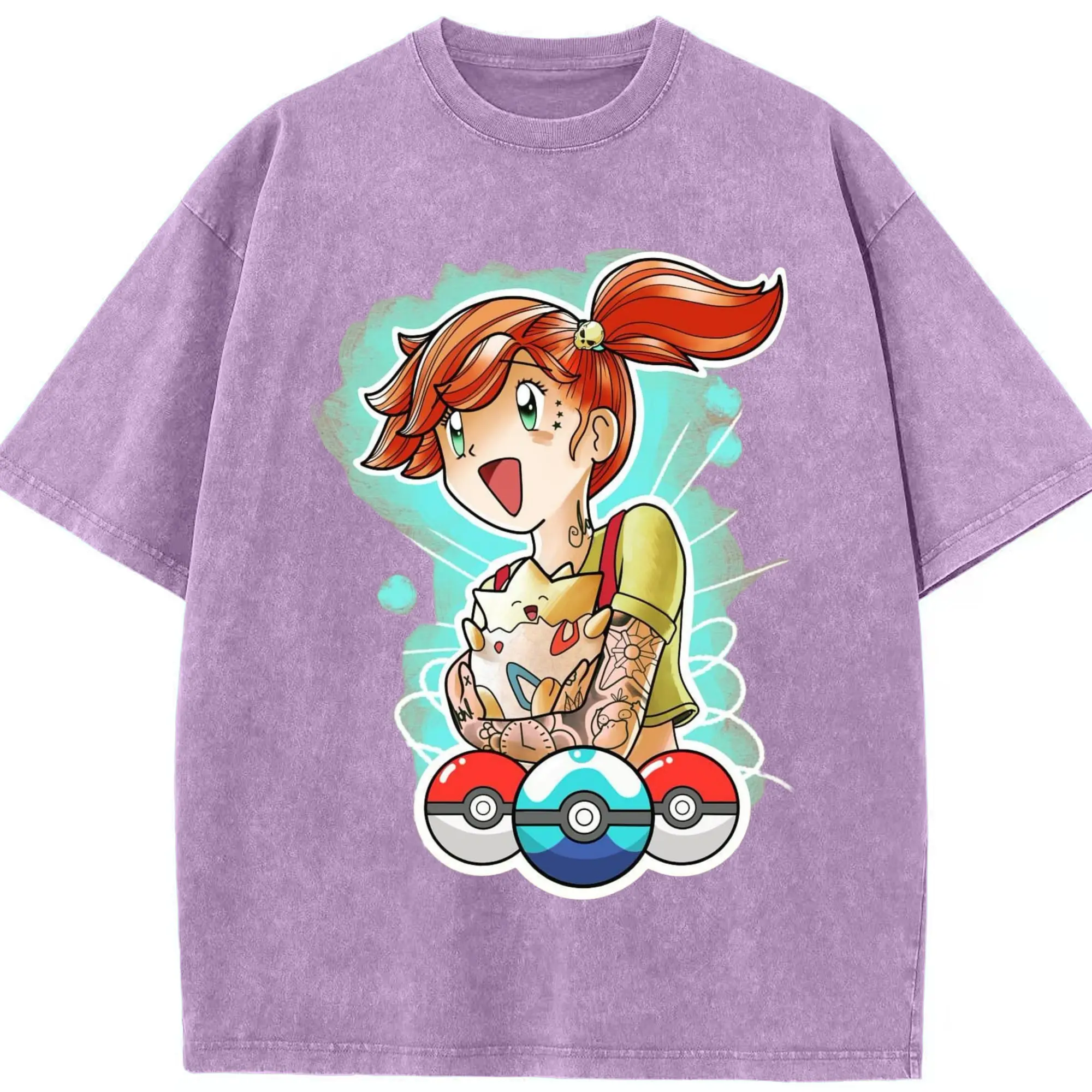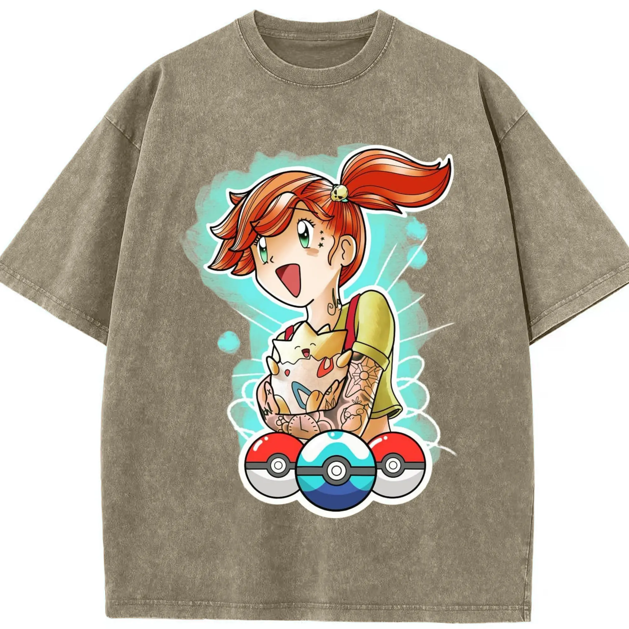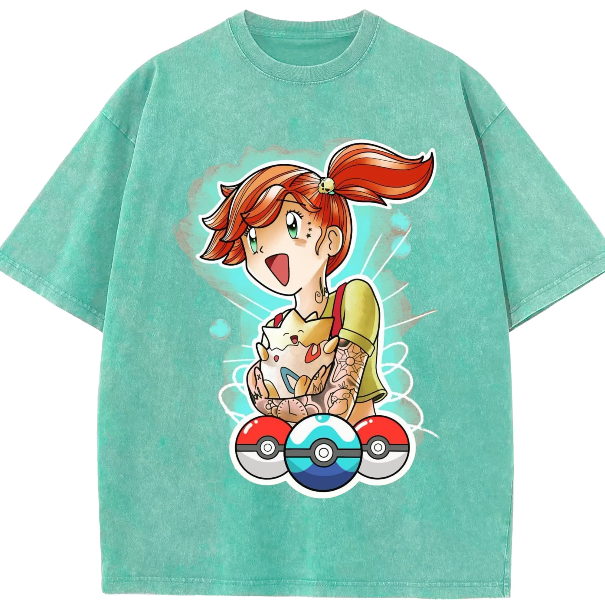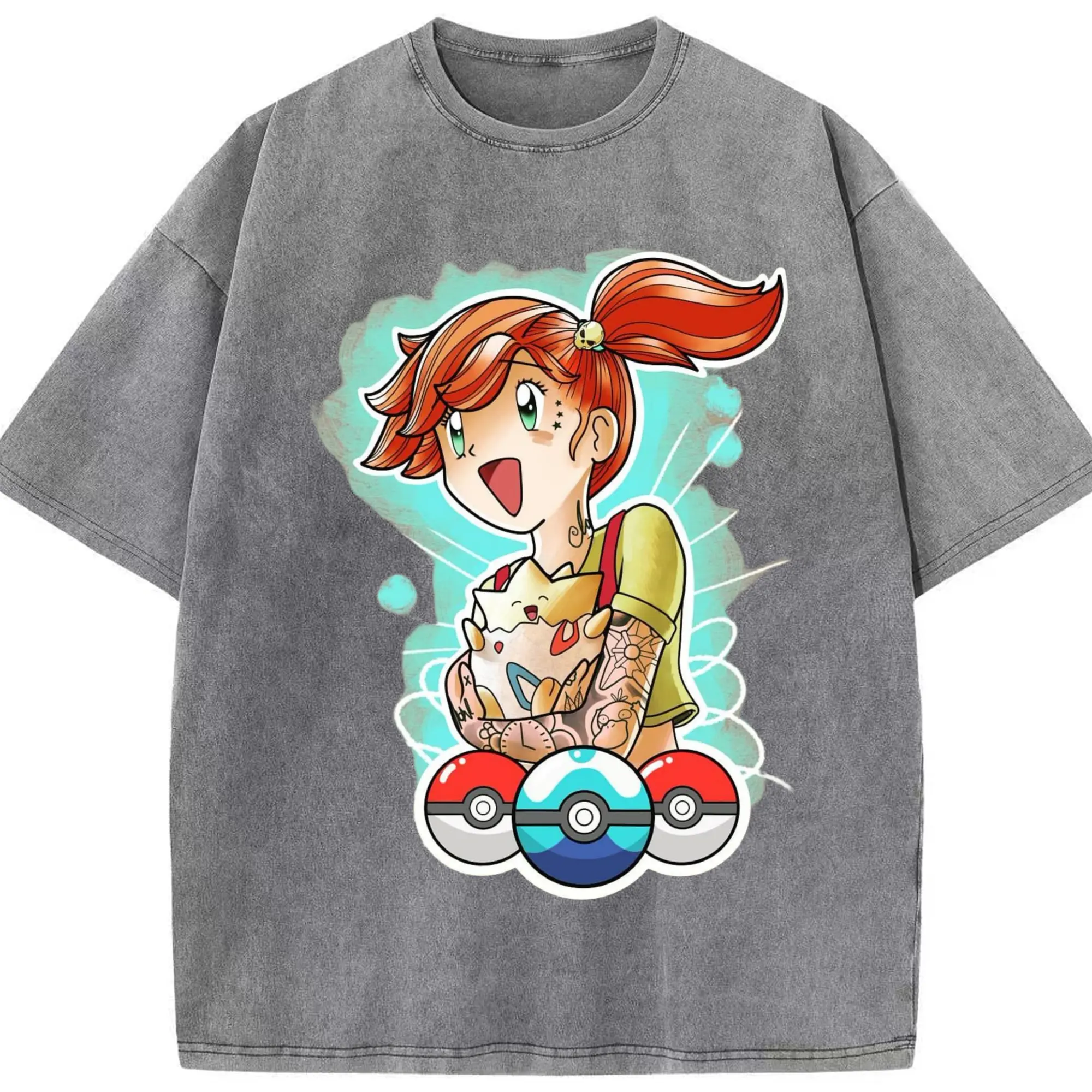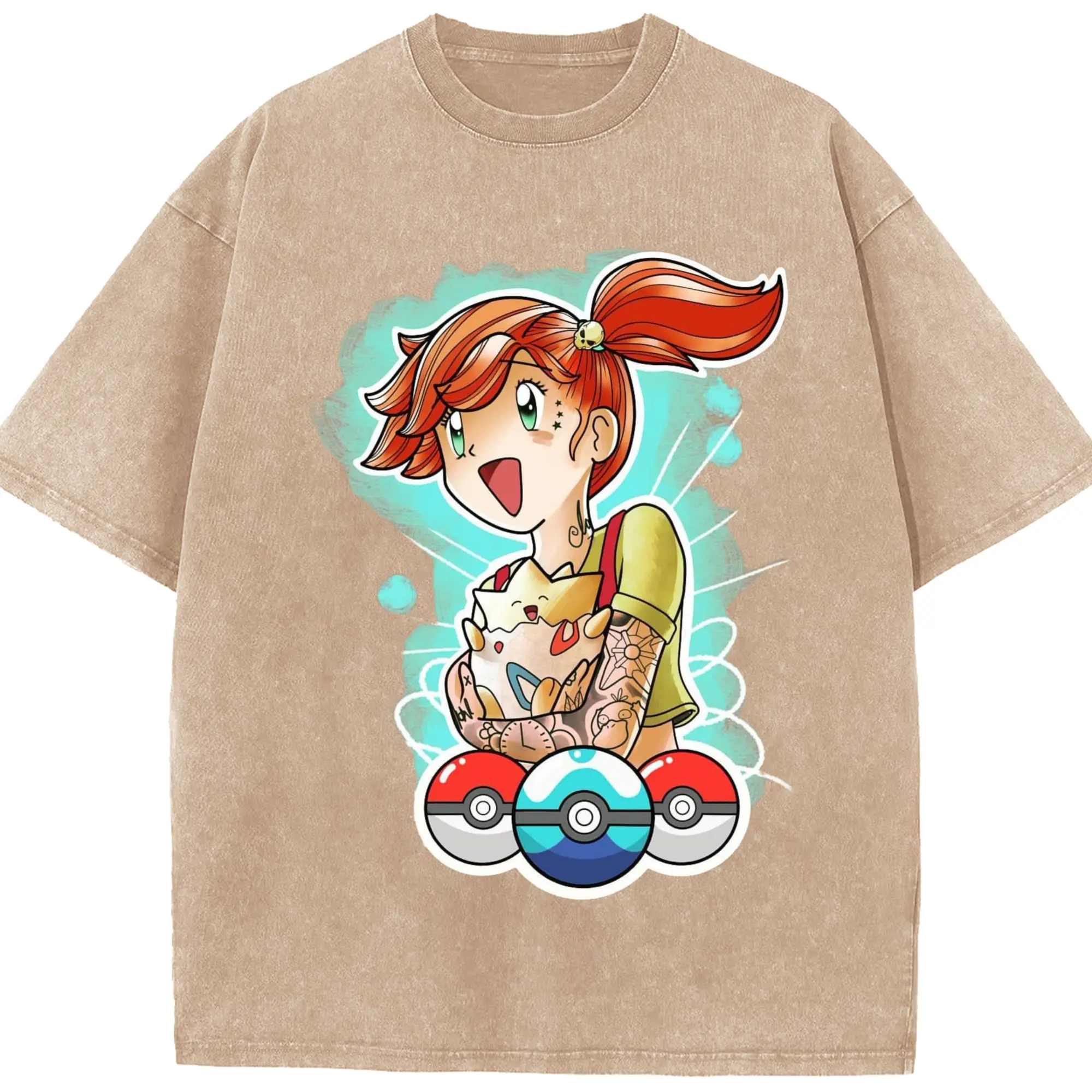 Women's pokemon misty tee - Washed Vintage Look 230g Cotton Oversized T-Shirt With Front Heat Transfer Print – Soft, Lightweight, Stylish Fit – Comfortable Casual Wear For Sports & Everyday Use